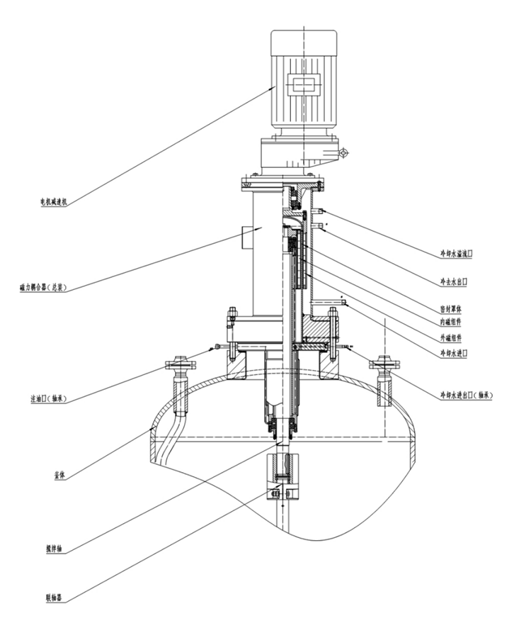 用稀土永磁制作的強磁回轉式耦合結構(磁力驅動裝置),磁力驅動裝置的基本制造材料均為鐵磁性物質,磁導率極佳,磁場在穿過用于密封合金層時幾乎沒有損耗。由此外部驅動永磁體產生的旋轉磁場可以有效被內部永磁體轉子接受,進而帶動反應器內的攪拌部件進行物料混合,攪拌速度為0~300r/min,甚至更高,可配推進、槳式、錨式、框式、螺帶等各種槳。